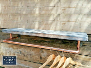 ZurĂŒckgewonnenes verbranntes Holzkohle-Regal mit Kupfer-Kleiderstange